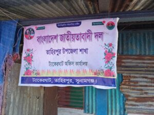 তাহিরপুরে মুক্তিযোদ্ধাদের পাঠাগার ঘরে রাজনৈতিক সাইনবোর্ড।