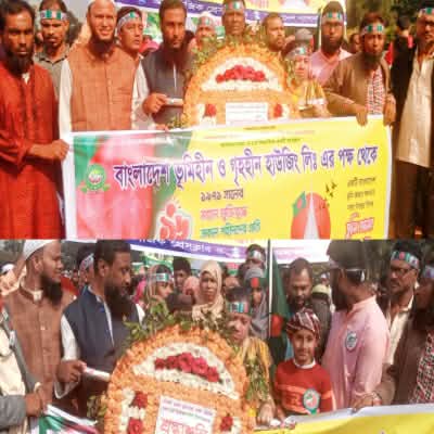 মহান বিজয় দিবস উপলক্ষে জাতির শ্রেষ্ঠ সন্তান বীর শহীদদের প্রতি গভীর শ্রদ্ধা নিবেদন করেছে বাংলাদেশ ভূমিহীন ও গৃহহীন হাউজিং লিমিটেড। মঙ্গলবার (১৬ ডিসেম্বর) দুপুর ১০টায় নবীনগরের জাতীয় স্মৃতিসৌধে সংগঠনের সভাপতি আওরঙ্গজেব কামাল-এর নেতৃত্বে পুষ্পস্তবক অর্পণের মাধ্যমে এ শ্রদ্ধা নিবেদন করা হয়।