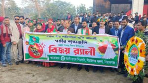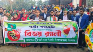 মঙ্গলবার (১৬ ডিসেম্বর-২০২৫ খ্রিঃ) ভোর ৬ জাতীয় পতাকা উত্তোলন করা হয় এরপর সকাল ৭টার দিকে- শহরে বিজয় র্যালি প্রধান প্রধান সড়ক প্রদক্ষিণ করে বাজার স্টেশন স্মৃতি স্তম্ভে পুষ্পার্ঘ অর্পণ করে পুনরায় র্যালি নিয়ে অগ্রণী ব্যাংক পিএলসি, সিরাজগঞ্জে সমাপ্ত করে আলোচনা সভা বীর শহিদদের রুহের মাগফেরাত কামনা করে বিশেষ দোয়া ও মোনাজাত অনুষ্ঠিত হয়। উক্ত র্যালির নেতৃত্ব দেন এবং অনুষ্ঠানে প্রধান অতিথি হিসেবে উপস্থিত ছিলেন, অগ্রণী ব্যাংক পিএলসি, সিরাজগঞ্জ-অঞ্চল প্রধান ও উপ-মহাব্যবস্থাপক জনাব মোঃ মোকাররম আলী। এসময়ে-অগ্রণী ব্যাংক পিএলসি, এস.এস. রোড শাখার এজিএম ও শাখা প্রধান মোঃ রফিকুল ইসলাম, নিউ মার্কেট শাখার এজিএম ও শাখা প্রধান মোঃ শফিজুল ইসলাম, স্টেশন রোড শাখার এজিএম ও শাখা প্রধান মোঃ লুৎফর রহমান, আঞ্চলিক কার্যালয়ের এসপিও (স্টাফ অফিসার) মোঃ আব্দুস সামাদ। এছাড়াও অঞ্চলাধীন ২১ টি শাখার নির্বাহী / ব্যবস্থাপক, কর্মকর্তা-কর্মচারীগণ বিজয় র্যালিতে অংশ গ্রহণ করেন ।