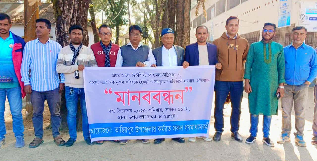 ডেইলি স্টার,প্রথম আলো অফিসে হামলার প্রতিবাদে তাহিরপুরে সাংবাদিকদের মানববন্ধন।