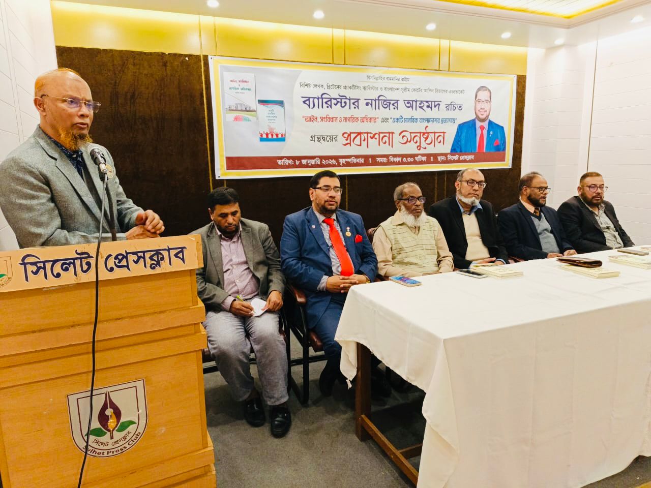 ৮ জানুয়ারি ২০২৬, বৃহস্পতিবার সন্ধ্যায় সিলেট প্রেসক্লাবের আমীনূর রশীদ চৌধুরী মিলনায়তনে ব্রিটেনের উচ্চ আদালতের প্র্যাকটিসিং ব্যারিস্টার, বিশিষ্ট লেখক ও সংবিধান বিশেষজ্ঞ, বাংলাদেশের সুপ্রীম কোর্টের আপিল বিভাগের আইনজীবী ও লন্ডন বারা অব নিউহ্যামের টানা তিনবারের সাবেক ডেপুটি স্পিকার ব্যারিস্টার নজির আহমদের লিখিত দুটি গ্রন্থের প্রকাশনা অনুষ্ঠানে বক্তারা এসব কথা বলেন।