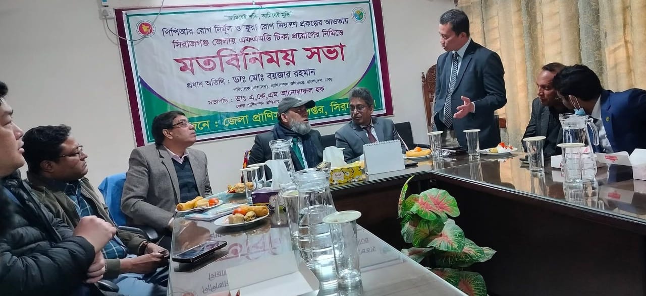 "আমিষেই শক্তি, আমিষেই মুক্তি" এই শ্লোগান নিয়ে - পিপিআর রোগ নির্মূল ও ক্ষুরা রোগ নিয়ন্ত্রণ প্রকল্পের আওতায়- সিরাজগঞ্জ জেলায় এফএমডি টিকা প্রয়োগের নিমিত্তে মতবিনিময় সভা অনুষ্ঠিত হয়। সিরাজগঞ্জ জেলা প্রাণিসম্পদ দপ্তরের আয়োজনে,