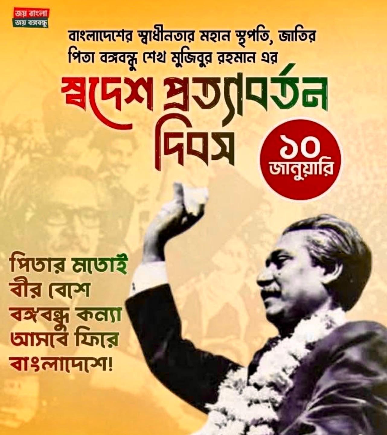 শেখ হাসিনা সংগ্রাম পরিষদ যুক্তরাষ্ট্র শাখার উদ্যোগে আজ রবিবার,১১ জানুয়ারি ২০২৬,সন্ধ্যা ৬টায় নিউইয়র্কের বাংগালি অধ্যশিষ জ্যাকসন হাইটসের নবান্ন রেস্টুরেন্টে স্বাধীনতার মহান স্থপতি জাতির পিতা বংগবন্ধু শেখ মুজিবুর রহমানের ১০ জানুয়ারি ১৯৭২ এ স্বদেশ প্রত্যাবর্তন দিবসের ৫৪তম বার্ষিকী উদযাপন অনুষ্ঠানের আয়োজন করেছে ।