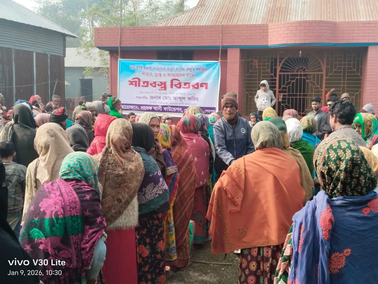 শেরপুরে শীতার্ত হতদরিদ্র মানুষের হাতে কম্বল তুলে দিলেন সাদেক আলী ফাউন্ডেশন। গত শুক্রবার, ৯ জানুয়ারি ২০২৬ শেরপুরে সদর উপজেলাধীন চর জংগলদী গ্রামে মরহুম সাদেক আলীর নিজ বাড়িতে প্রায় দু'শতাধিক দরিদ্র ও অসহায় মানুষদের মাঝে শীতবস্ত্র বিতরণ করা হয়। এ সময় সাদেক আলী ফাউন্ডেশনের নির্বাহ পরিচালক আব্দুল করিমের সভাপতিত্বে খালেদ মোশাররফ জনি’র পরিচালনায় সংক্ষিপ্ত আলোচনা সভা অনুষ্ঠিত হয়।আলোচনা সভায় অন্যান্যের মধ্যে বক্তব্য রাখেন জামালপুর জেনারেল পোষ্ট অফিসের সহকারী পোস্ট মাস্টার জেনারেল শেখ ফরিদ,স্হানীয় ওয়ার্ডের মেম্বার জাবেদ আলী,খুনুয়া মৌলভীনগর উচ্চ বিদ্যালয়ের শিক্ষক সাইফুল ইসলাম, সমাজকর্মী শামীম হোসেন, ও চর জংগলদীর মধ্য পাড়া জামে মসজিদের সভাপতি সোহাগ মিয়া প্রমুখ।খবর আইবিএননিউজ।