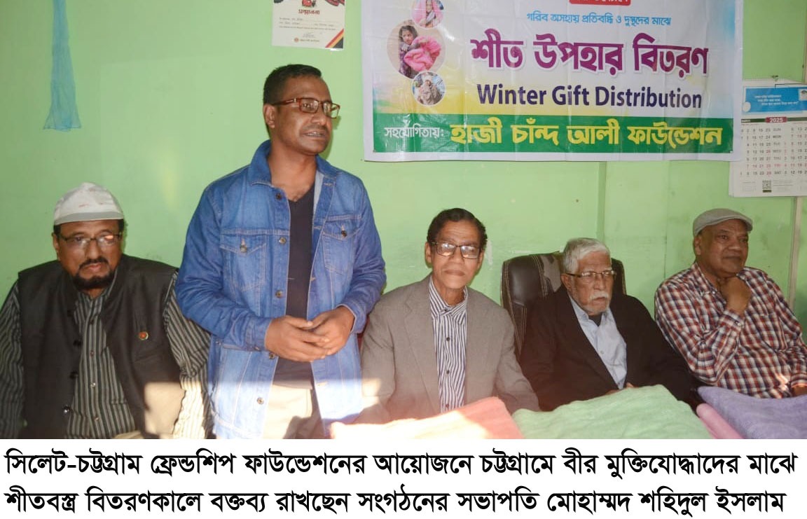 সিলেট-চট্টগ্রাম ফ্রেন্ডশিপ ফাউন্ডেশনের উদ্যোগে ও হাজী চাঁন্দ আলী ফাউন্ডেশনের সহযোগিতায় ১২ জানুয়ারি, সোমবার, বিকাল ৪ টায় নগরীর পশ্চিম খুলশী জালালাবাদ মুক্তিযোদ্ধা কলোনীতে বীর মুক্তিযোদ্ধা পরিবারের মাঝে শীতবস্ত্র বিতরণ করা হয়।