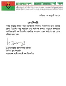 মঙ্গলবার (১৩ জানুয়ারি) কেন্দ্রীয় বিএনপির সিনিয়র যুগ্ম মহাসচিব অ্যাডভোকেট রুহুল কবির রিজভীর স্বাক্ষরিত এক বিজ্ঞপ্তিতে এ তথ্য জানানো হয়।
