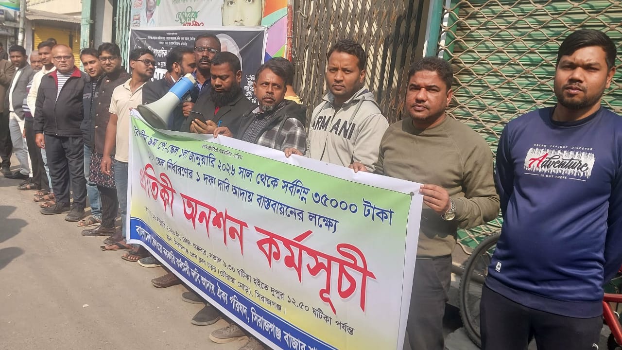 বৈষম্যহীন নবম পে-স্কেল থেকে সর্বনিম্ন ৩৫ হাজার টাকা বেতন স্কেল নির্ধারনের ১'দফা দাবী আদায় বাস্তবায়নের লক্ষ্যে সিরাজগঞ্জে প্রতিকী অনশন কর্মসূচী পালিত হয়েছে।