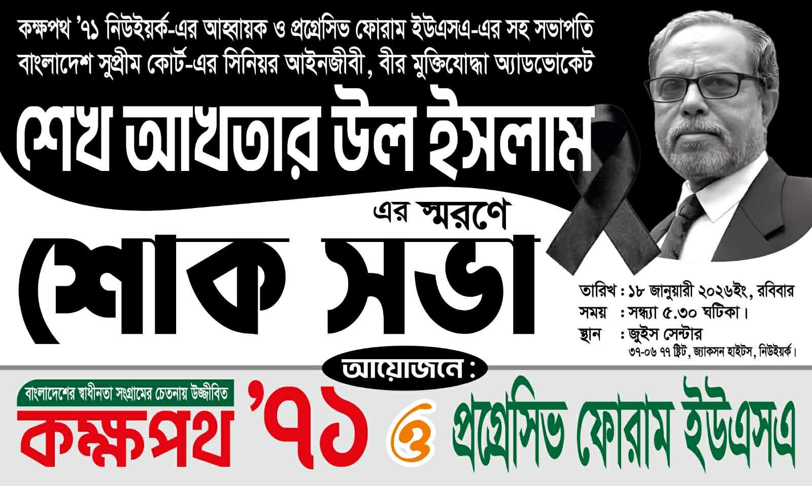 গক রবিবার,১৮ জানুয়ারী ২০২৬নিউইয়র্কের জ্যাকসন হাইটসে এর জুইস সেন্টারে সন্ধ্যা ৭টায় কক্ষপথ”৭১ নিউইয়ক ও প্রগ্রেসিভ ফোরাম ইউএসএ এর উদ্যোগে বীর মুক্তিযোদ্ধা অ্যাডভোকেট শেখ আকতার উল ইসলাম এর স্মরণে শোক সভা অনুষ্ঠিত হয়। উক্ত শোক সভায় সভাপতিত্ব করেন প্রগ্রেসিভ ফোরামের সাবেক সভাপতি বীর মুক্তিযোব্ধা খোরশেদ উল ইসলাম ও সঞ্চালনা করেন কক্ষপথ”৭১ নিউইয়কের যুগ্ম আহ্বায়ক অ্যাডভোকেট মিয়া এইচ জাকির। সভার শুরুতে প্রয়াত অ্যাডভোকেট শেখ আকতার উল ইসলামের সন্মানে ১ মিনিট নিরবতা পালন করা হয়।