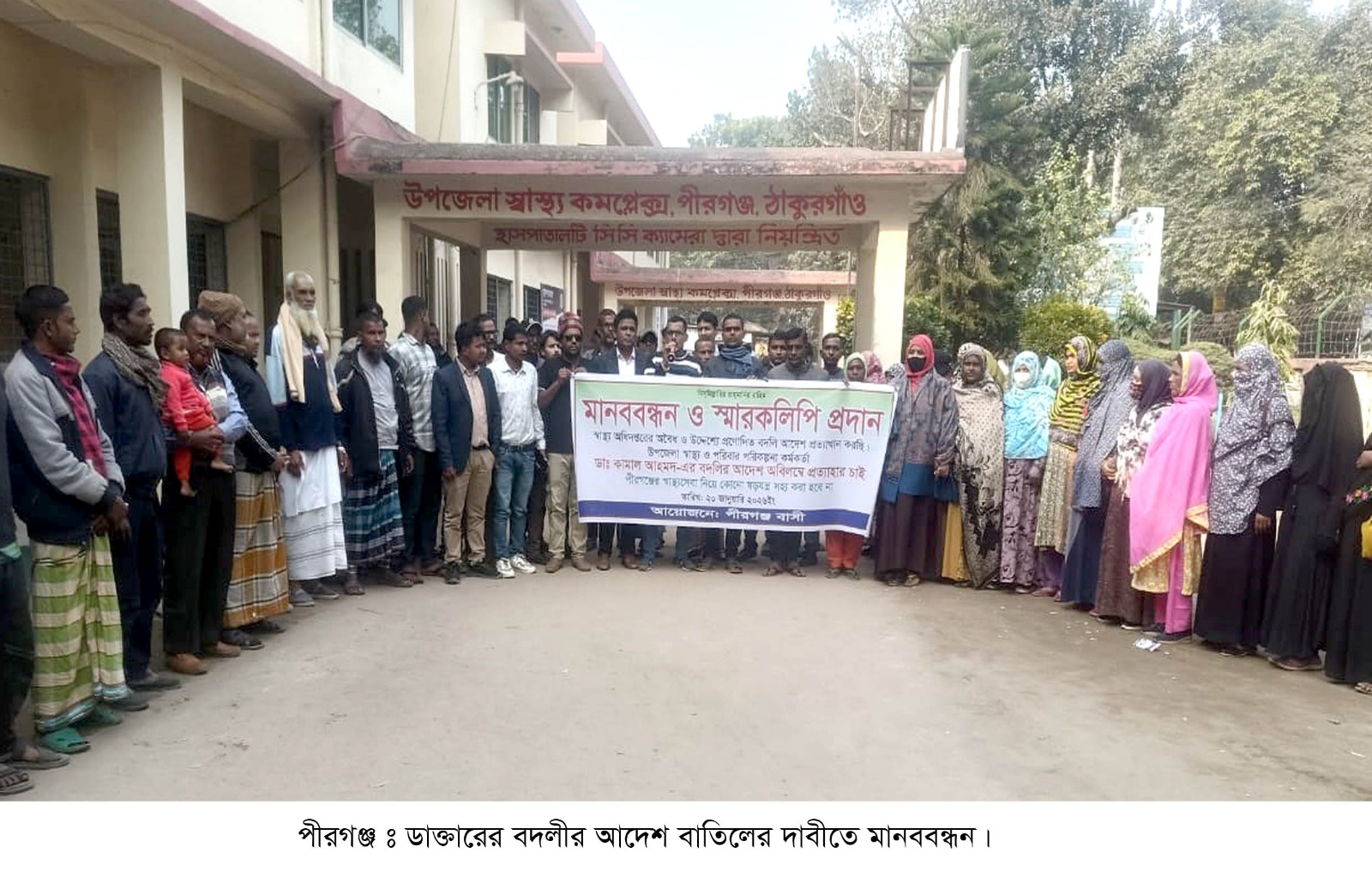 ফুসে উঠেছে আমজনতা পীরগঞ্জে ডাক্তারের বদলীর আদেশ বাতিলের দাবীতে হাসপাতালে মানববন্ধন