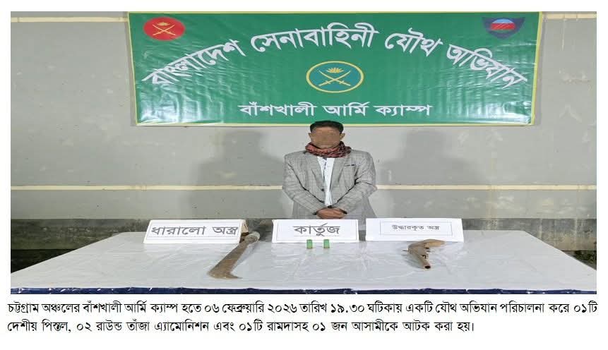 বাঁশখালীতে সেনাবাহিনীর বিশেষ অভিযানে অস্ত্রসহ তালিকাভুক্ত সন্ত্রাসী গ্রেপ্তার