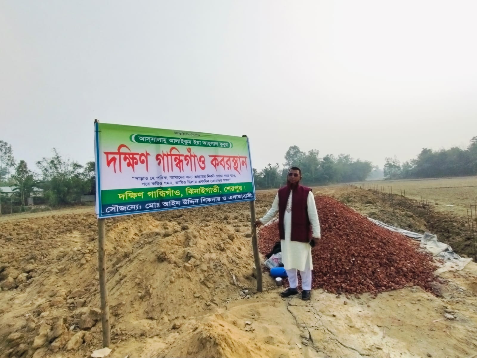 শেরপুর জেলার ঝিনাইগাতী উপজেলার দক্ষিণ গান্ধীগাও গ্রামের কৃতি সন্তান আব্দুল সামাদ শিকদাদের ছেলে আলহাজ্ব আইনুদ্দিন সিকদার গ্রামবাসীর জন্য কবরস্থান নির্মাণ করে এক অনন্য দৃষ্টান্ত স্থাপন করলেন।