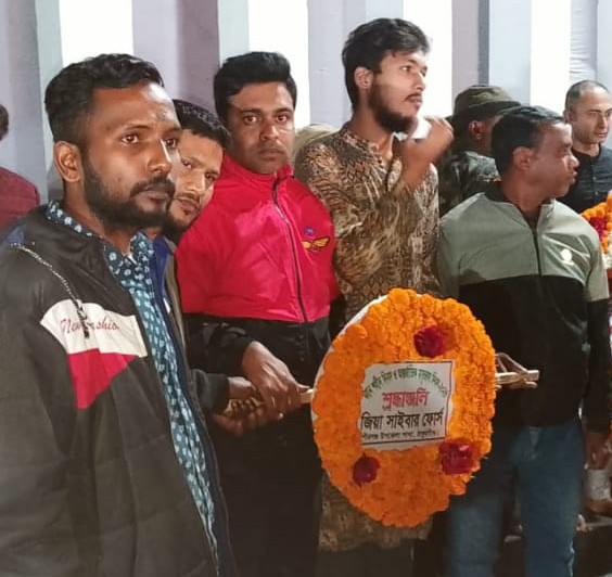 শনিবার রাত ১২টা ০১ মিনিটে পীর গঞ্জ উপজেলা জিয়া সাইবার ফোর্স শাখায় পক্ষ থেকে কেন্দ্রীয় শহীদ মিনারে প্রথম প্রহরে পুষ্পস্তবক অর্পণের মাধ্যমে ভাষা শহীদদের প্রতি শ্রদ্ধা নিবেদন করা হয়। এসময় পীর গঞ্জ জিয়া সাইবার ফোর্স উপজেলা শাখায় আহবায়ক মোঃ মাহফুজুর রহমান্ সদস্য সচিব মোঃ শরীফ, যুগ্ম আহ্বায়ক মোঃ মোশারফ্ হোসেন, যুগ্ন আহ্বায়ক রেজওয়ানুল ফেরদৌস রিয়াদ, যুগ্ন আহ্বায়ক মোঃ নুরুজ্জামান, সদস্য মোঃ মনিরুল ইসলাম সুজন, ও উপজেলা প্রশাসন,বীর মুক্তিযোদ্ধা,পুলিশ প্রশাসন,