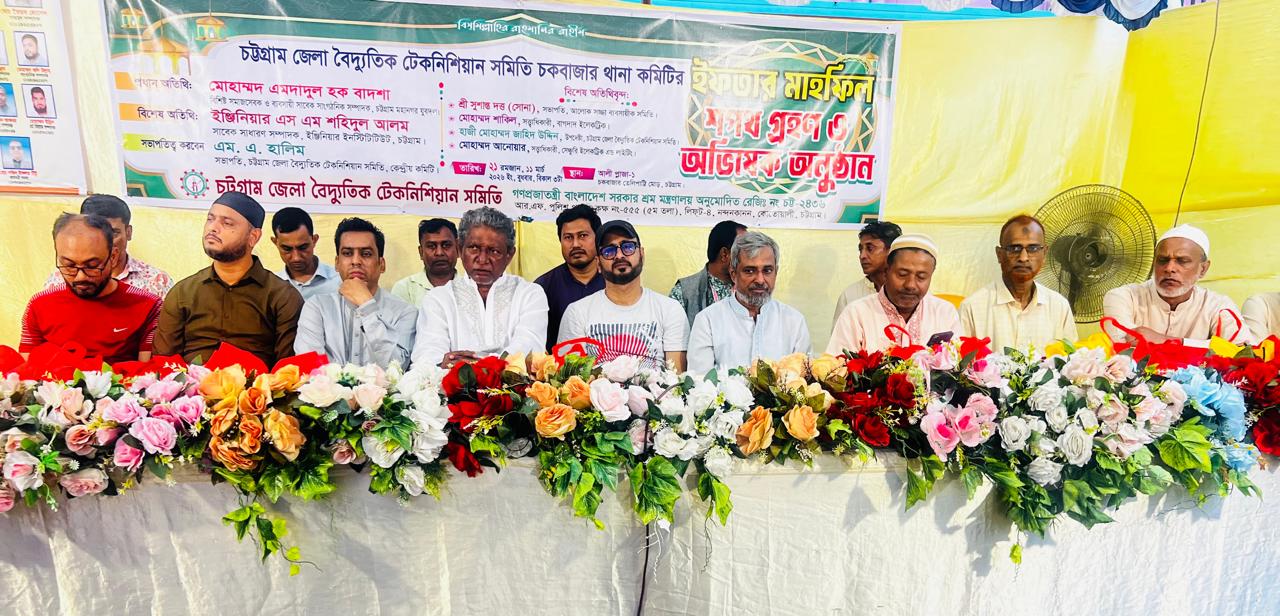 চট্টগ্রাম জেলা বৈদ্যুতিক টেকনিশিয়ান সমিতি চকবাজার থানা কমিটির উদ্যোগে ইফতার মাহফিল, শপথ গ্রহণ ও অভিষেক অনুষ্ঠান অনুষ্ঠিত হয়েছে।