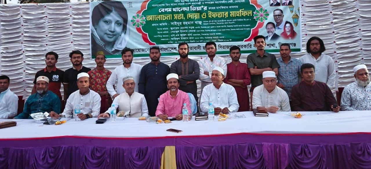 সিরাজগঞ্জ জেলা শহরের ঐতিহ্যবাহী শ্রেষ্ঠ বিদ্যাপীঠ সিরাজগঞ্জ সরকারি কলেজ জাতীয়তাবাদী ছাত্রদল শাখা'র আয়োজনে, বিএনপি'র সাবেক চেয়ারপার্সন আপোষহীন দেশনেত্রী, বাংলাদেশের তিন তিনবারের সাবেক প্রধানমন্ত্রী মরহুমা বেগম খালেদা জিয়ার রুহের মাগফেরাত কামনা করে- আলোচনাসভা, দোয়া-মোনাজাত ও ইফতার মাহফিল অনুষ্ঠিত হয়।