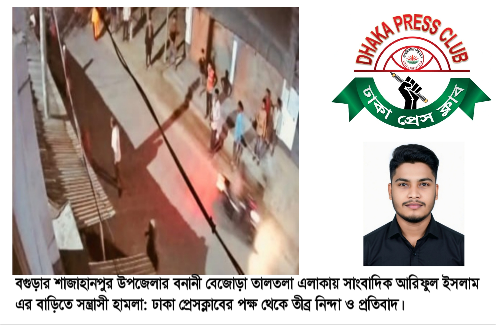 স্টাফ রিপোর্টার: সংবাদ প্রকাশের জেরে বগুড়া জেলার শাজাহানপুর উপজেলার বনানী বেজোড়া তালতলা এলাকায় সাংবাদিক আরিফুল ইসলামের বাড়িতে সন্ত্রাসী হামলার ঘটনায় গভীর উদ্বেগ প্রকাশ করেছে ঢাকা প্রেসক্লাব।