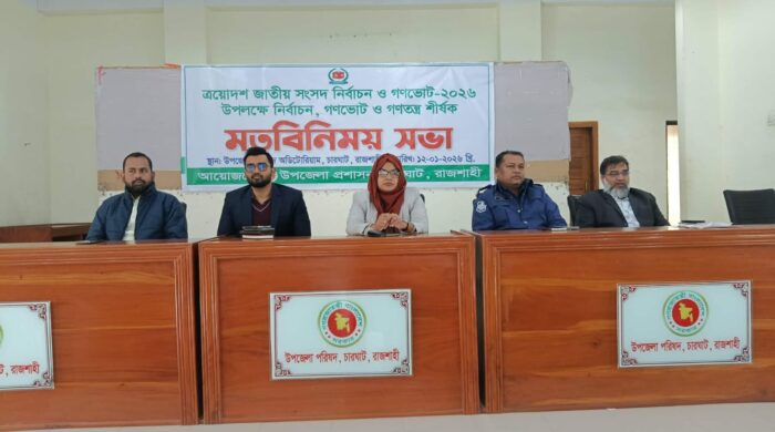মৌসুমী দাস, চারঘাট (রাজশাহী) প্রতিনিধিঃ রাজশাহীর চারঘাটে ত্রয়োদশ জাতীয় সংসদ নির্বাচন ও গণভোট-২০২৬ উপলক্ষে নির্বাচন, গণভোেট ও গণতন্ত্র শীর্ষক মতবিনিময় সভা অনুষ্ঠিত হয়েছে। সোমবার (১২ জানুয়ারি) সকাল ১০ টায় উপজেলা