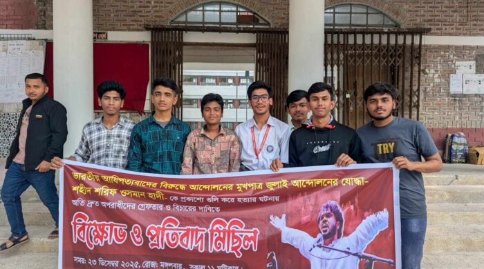 মোঃ ছোবাহান হাওলাদার বোরহানউদ্দিন (ভোলা) সংবাদদাতা ভারতীয় আধিপত্যবাদের বিরুদ্ধে আন্দোলনের মুখপাত্র ও জুলাই আন্দোলনের যোদ্ধা শরীফ উসমান হাদিকে প্রকাশ্যে গুলি করার ঘটনায় অতিদ্রুত খুনীদের বিচারের দাবিতে ভোলা পলিটেকনিক ইনস্টিটিউটের ছাত্র-ছাত্রীদের