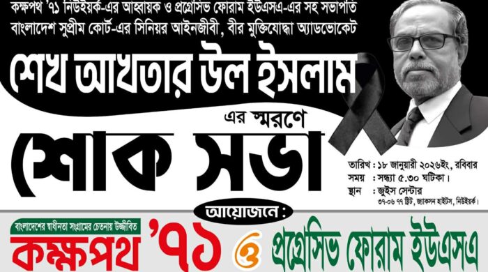হাকিকুল ইসলাম খোকন,বাপসনিউজঃ গক রবিবার,১৮ জানুয়ারী ২০২৬নিউইয়র্কের জ্যাকসন হাইটসে এর জুইস সেন্টারে সন্ধ্যা ৭টায় কক্ষপথ”৭১ নিউইয়ক ও প্রগ্রেসিভ ফোরাম ইউএসএ এর উদ্যোগে বীর মুক্তিযোদ্ধা অ্যাডভোকেট শেখ আকতার উল ইসলাম এর আরও পড়ুন
